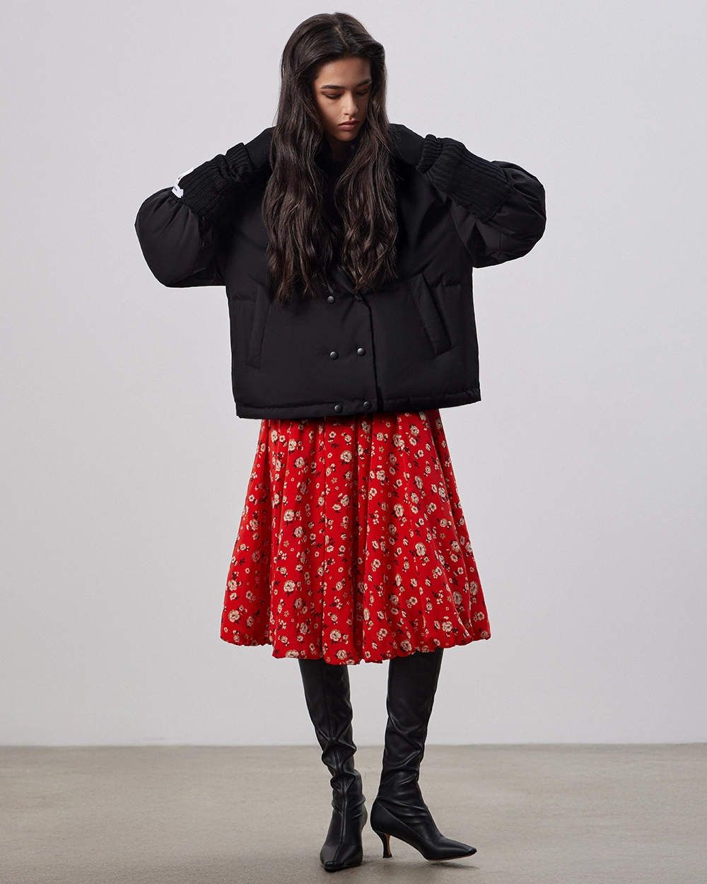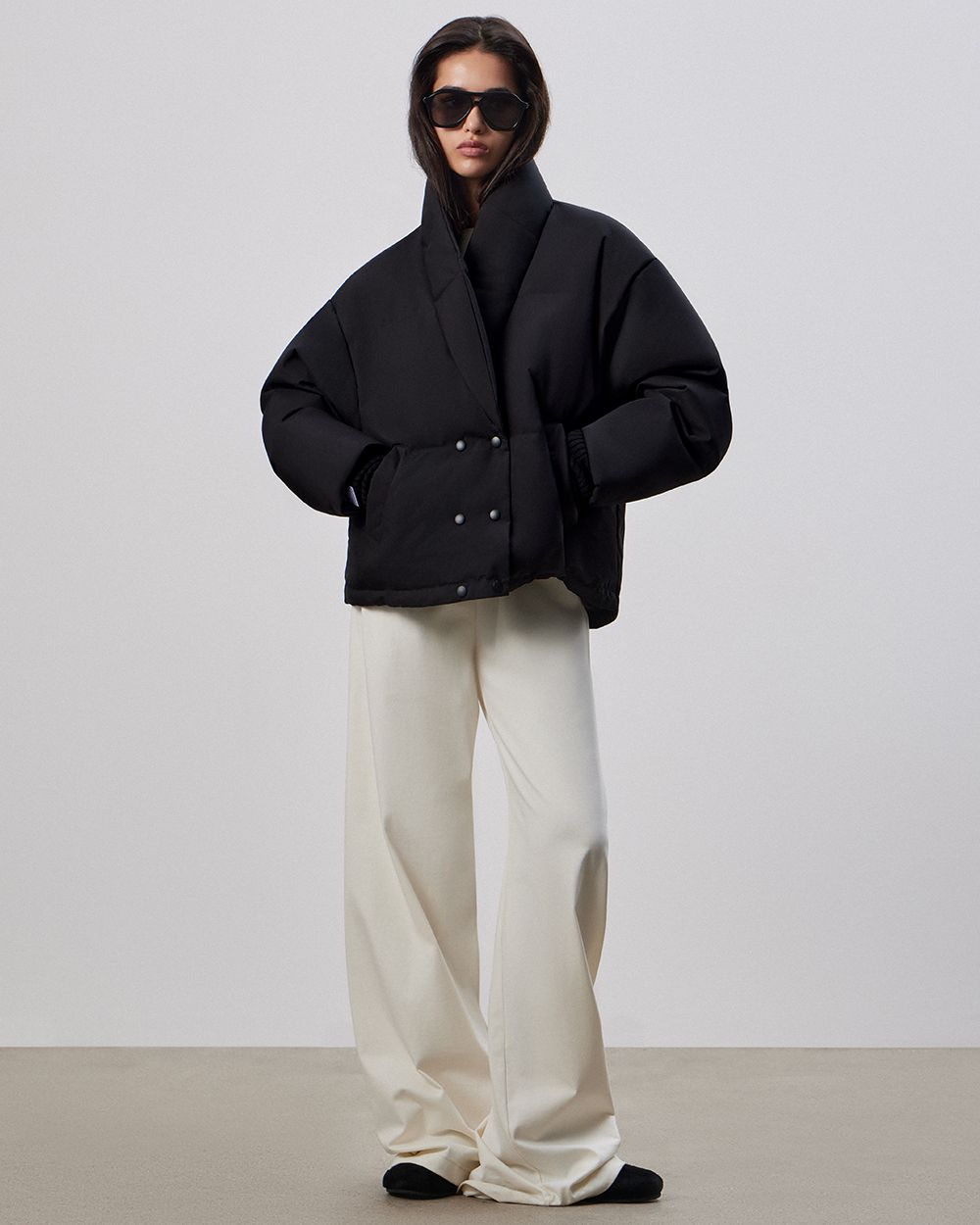 Объемный укороченный пуховик с шалевым воротником. Наполнитель из натуральных пуха и пера надежно сохраняет теплый воздух без утяжеления, благодаря чему согревает даже в самую холодную погоду. Классический черный цвет делает вещь универсальной и позволяет использовать её в образах разной стилистики.
