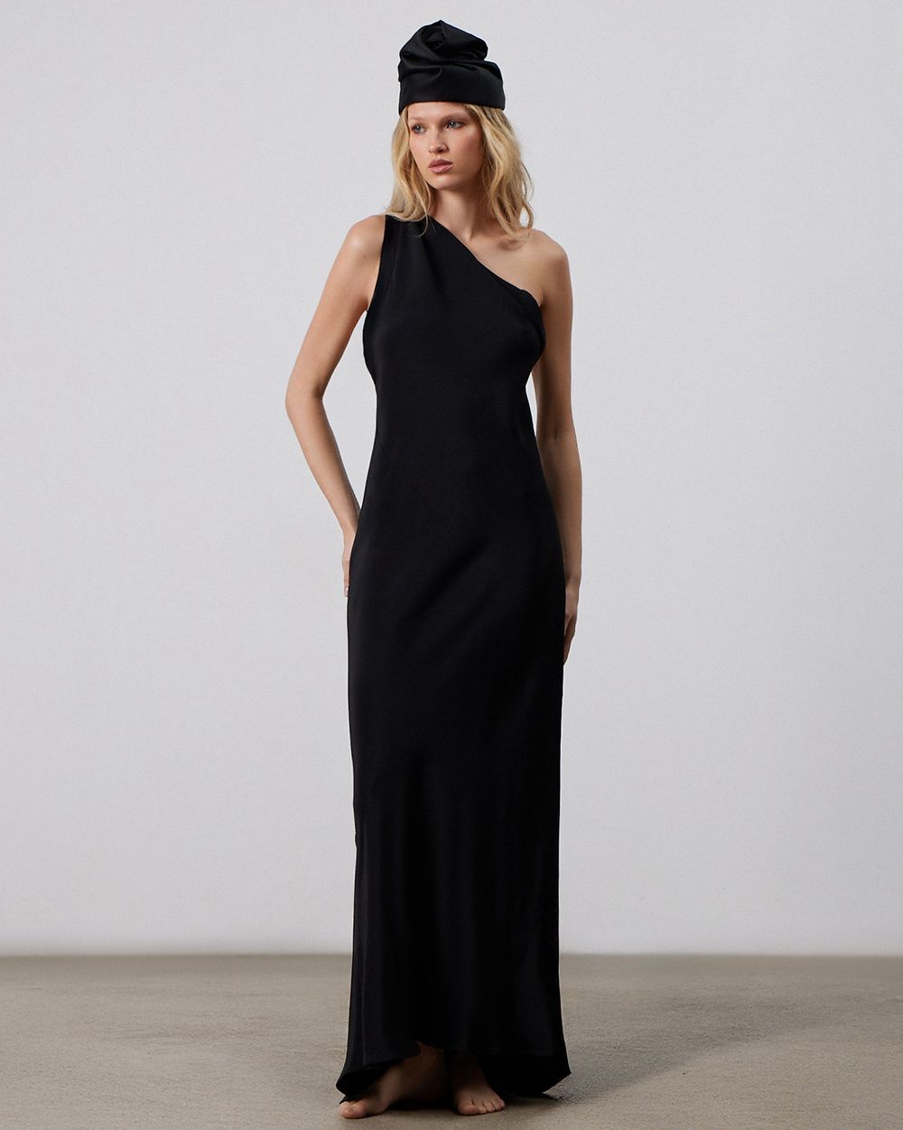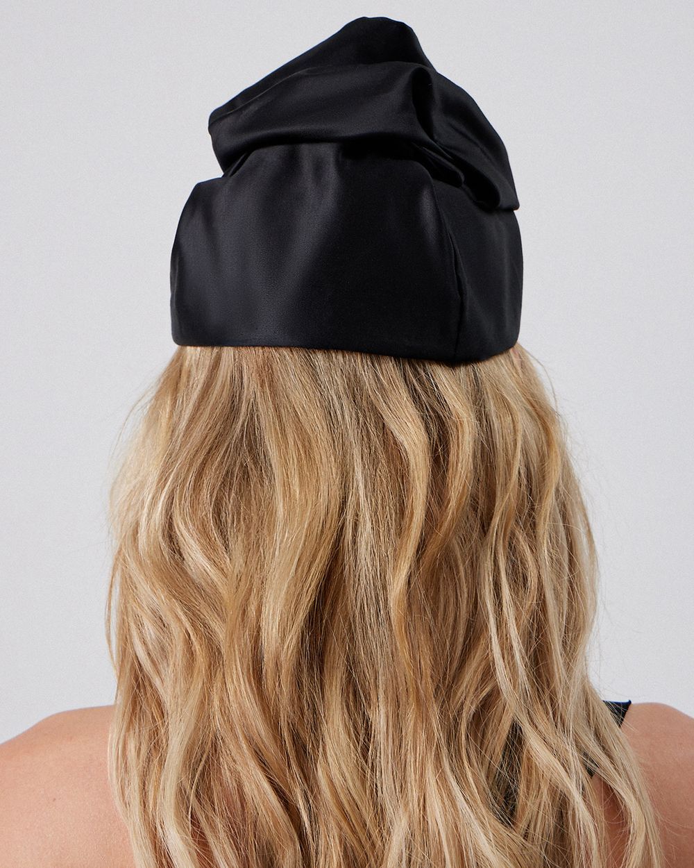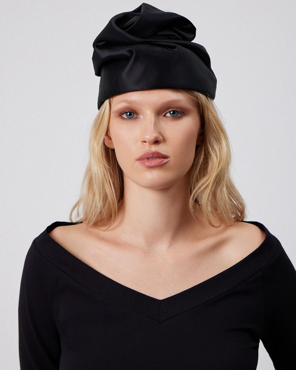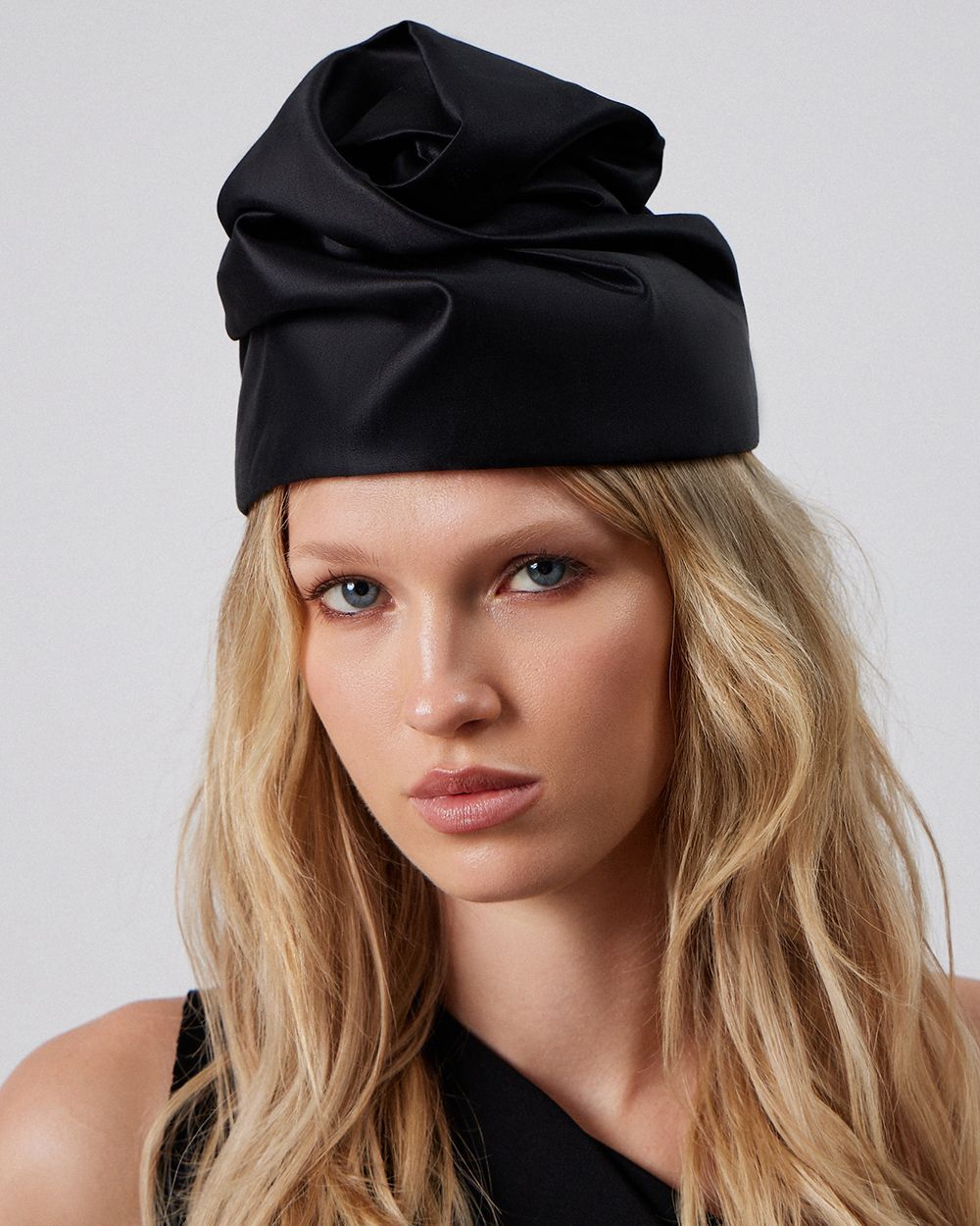 Высокая чёрная чалма с декоративными складками в виде цветка. Будучи компактной, она гармонично встроится в вечерний образ. Этот головной убор — результат кропотливого труда театральных мастеров, поэтому каждая единица имеет неповторимый облик. Основными материалами стали мягкий хлопок и шёлк, что обеспечивает комфортное прилегание и приятные ощущения в использовании.