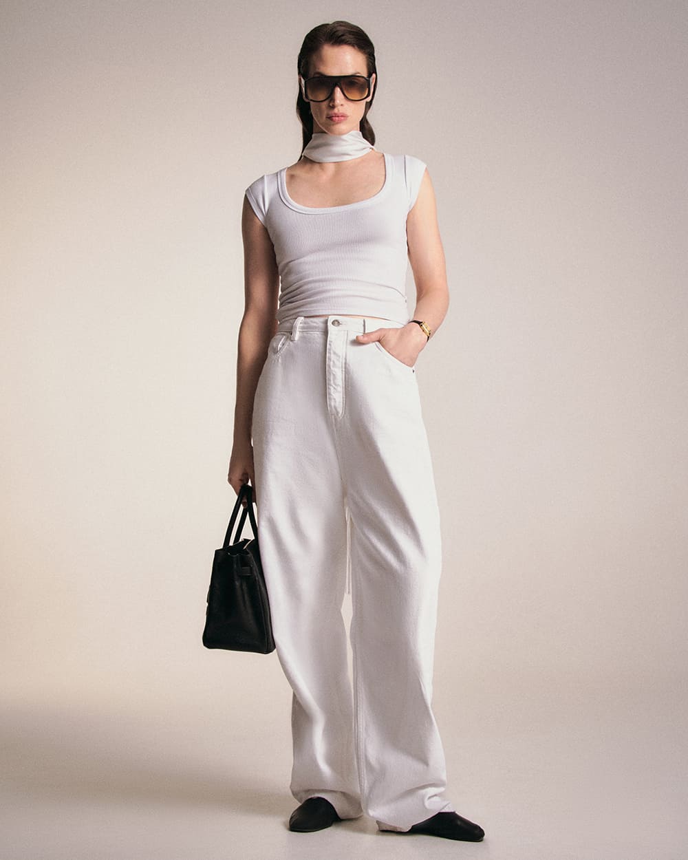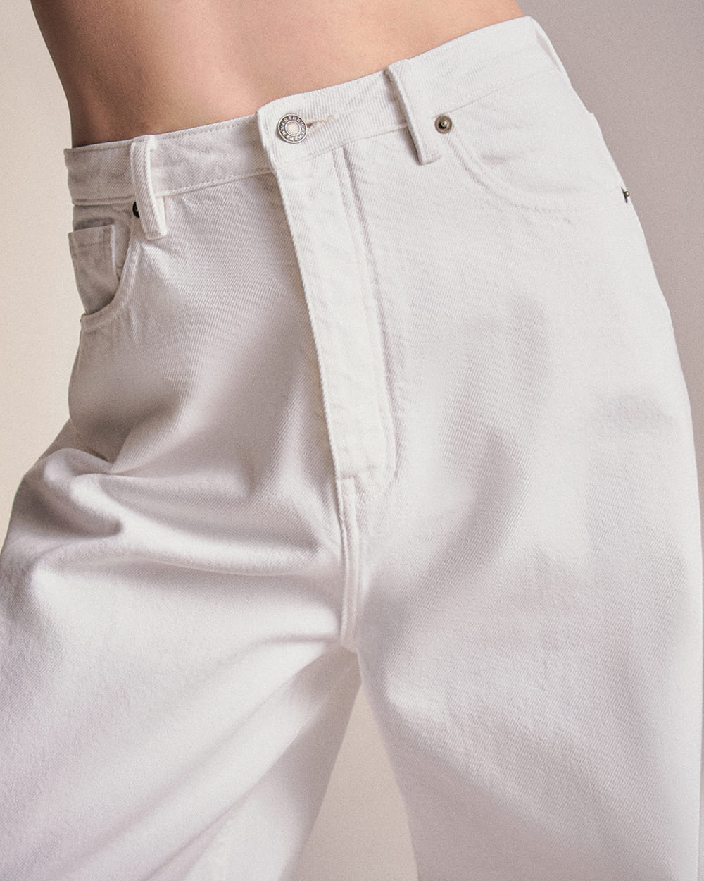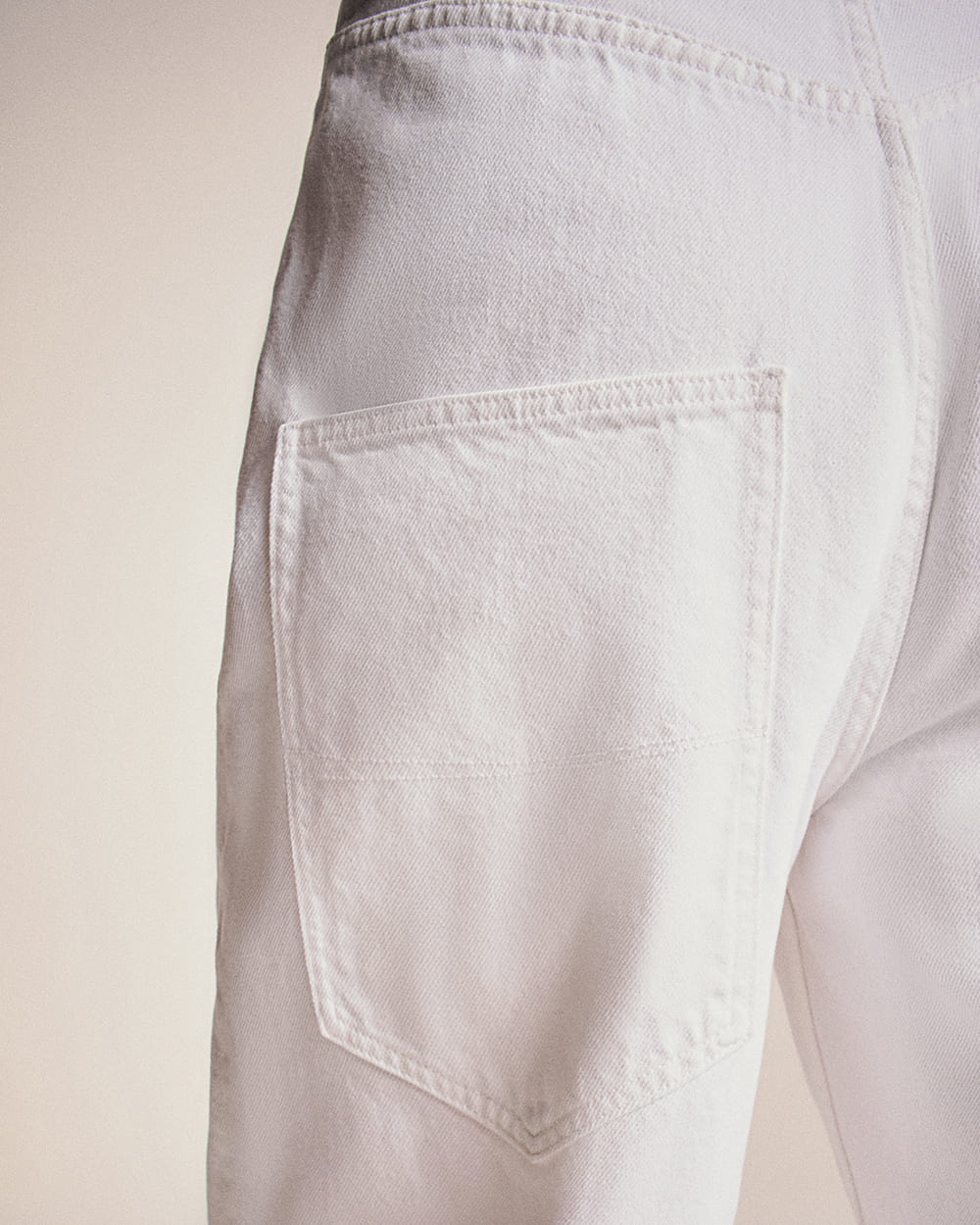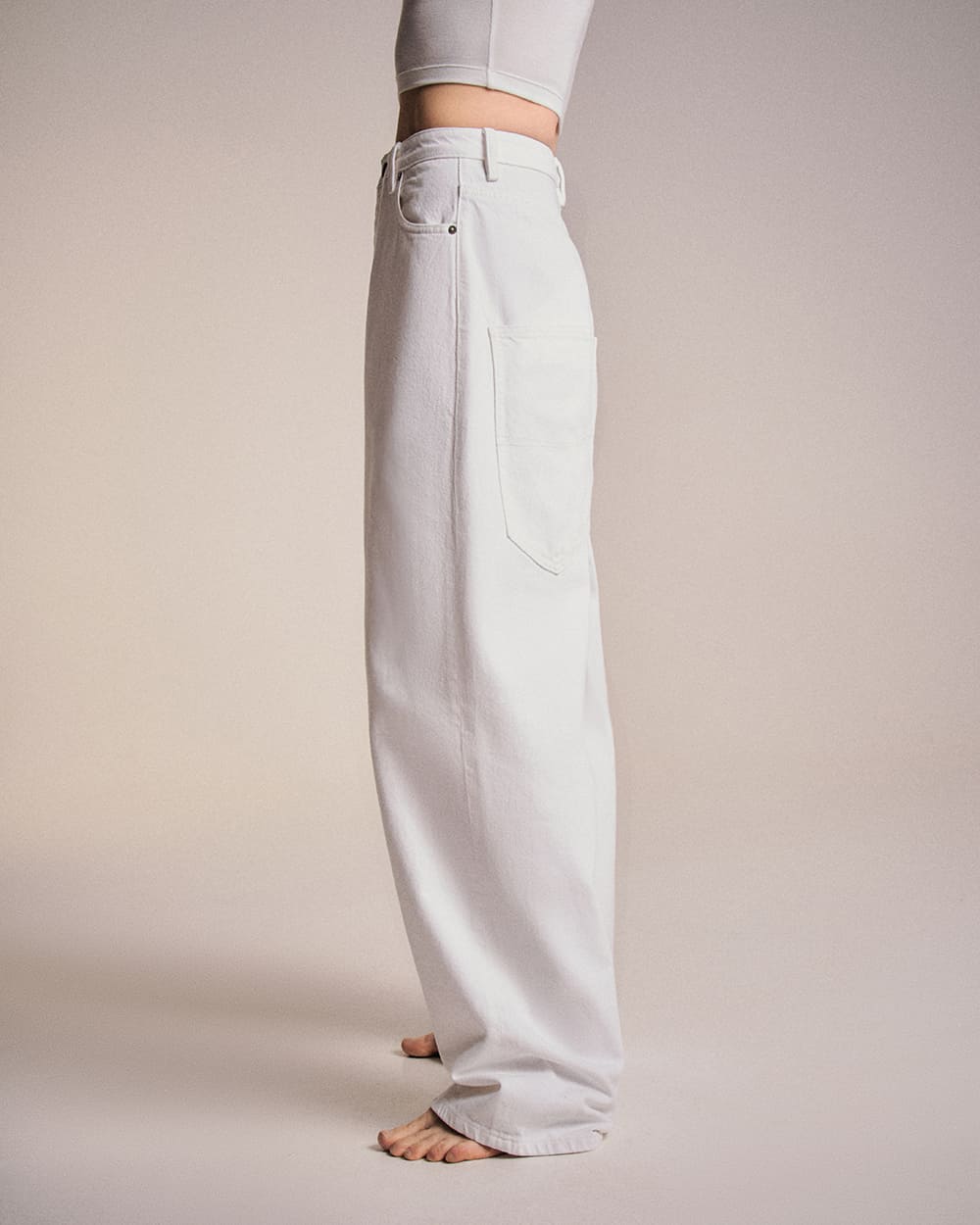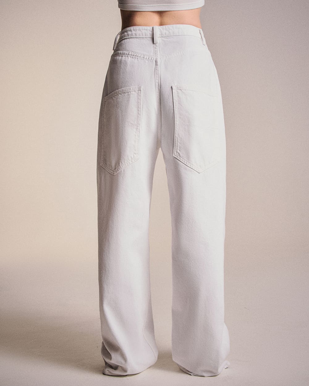 Широкие прямые джинсы в белом цвете с большими накладными карманами. Выполнены из плотного премиального денима. Благодаря удлиненному силуэту они ложатся мягкими складками на обувь. Фасон легко адаптируется под базовый гардероб и работает с абсолютно любым верхом.