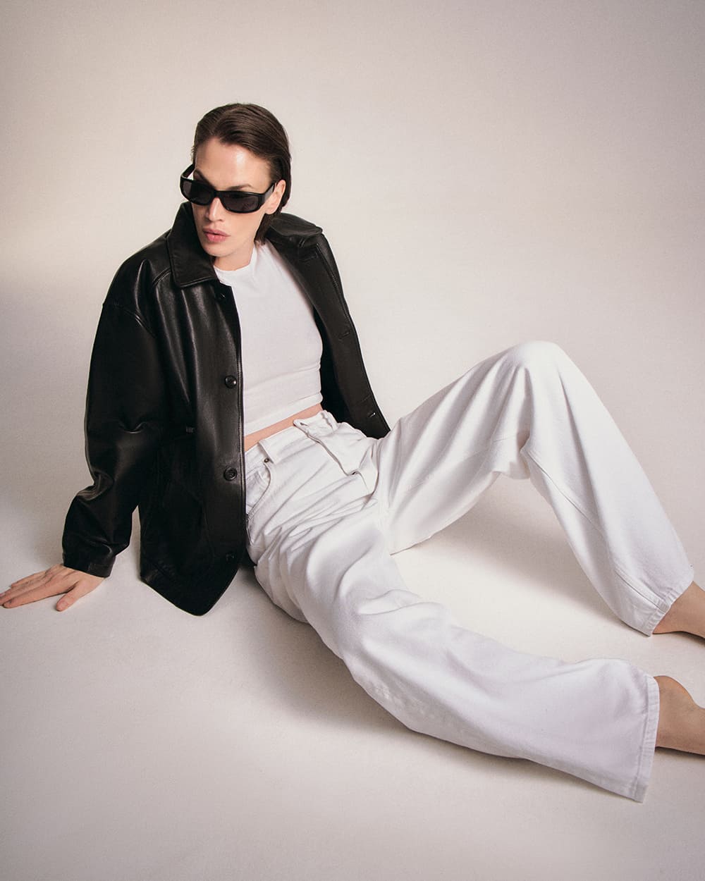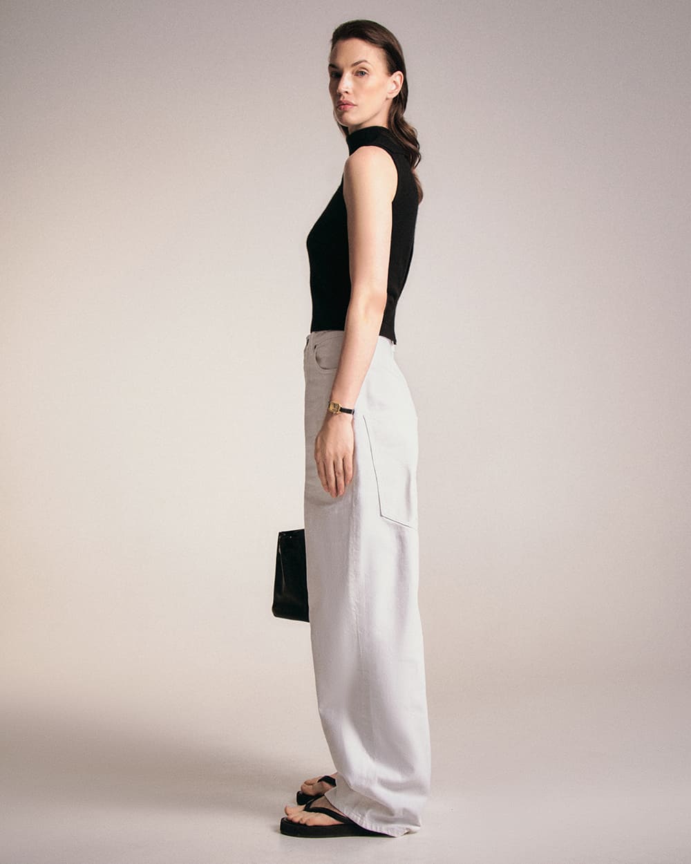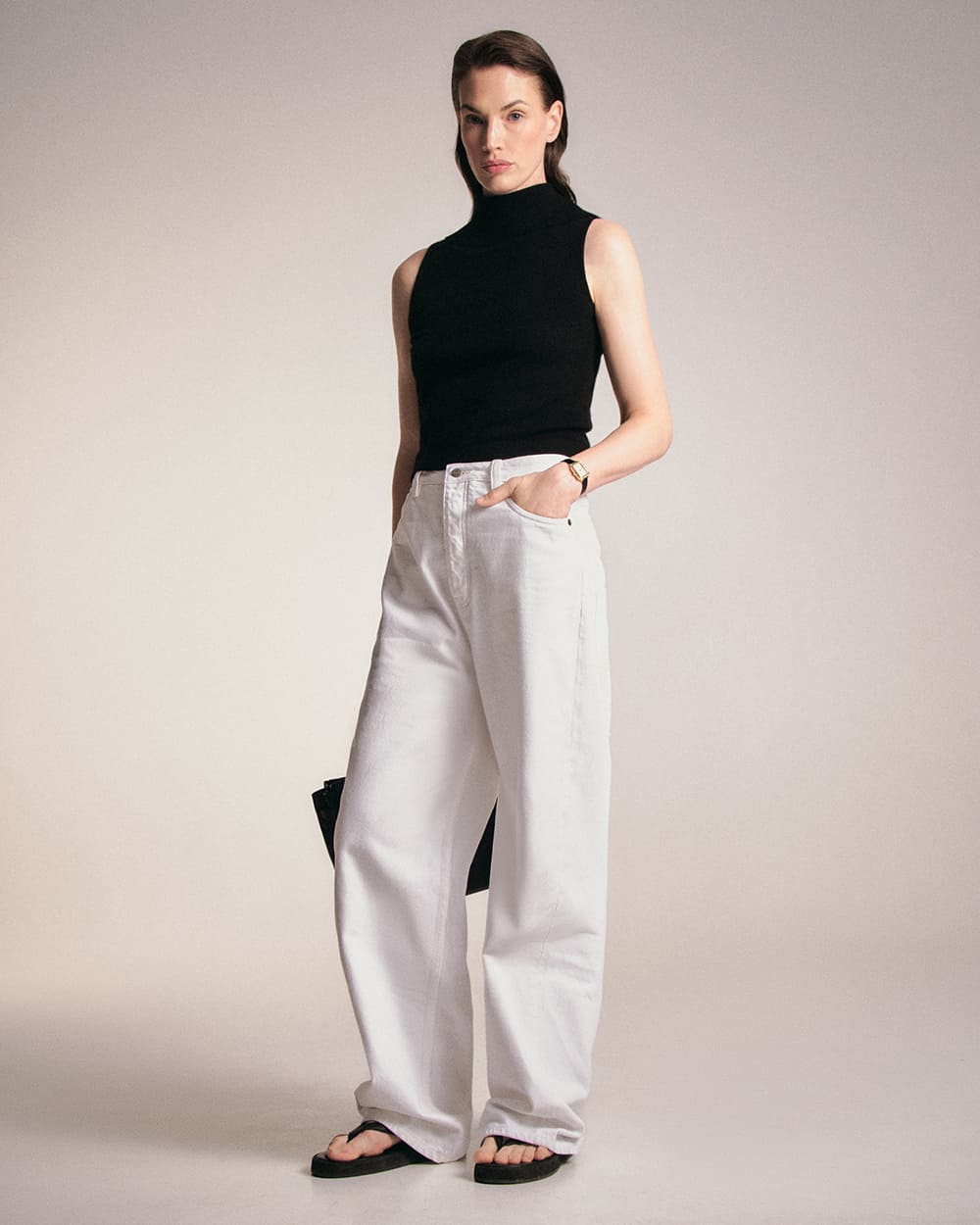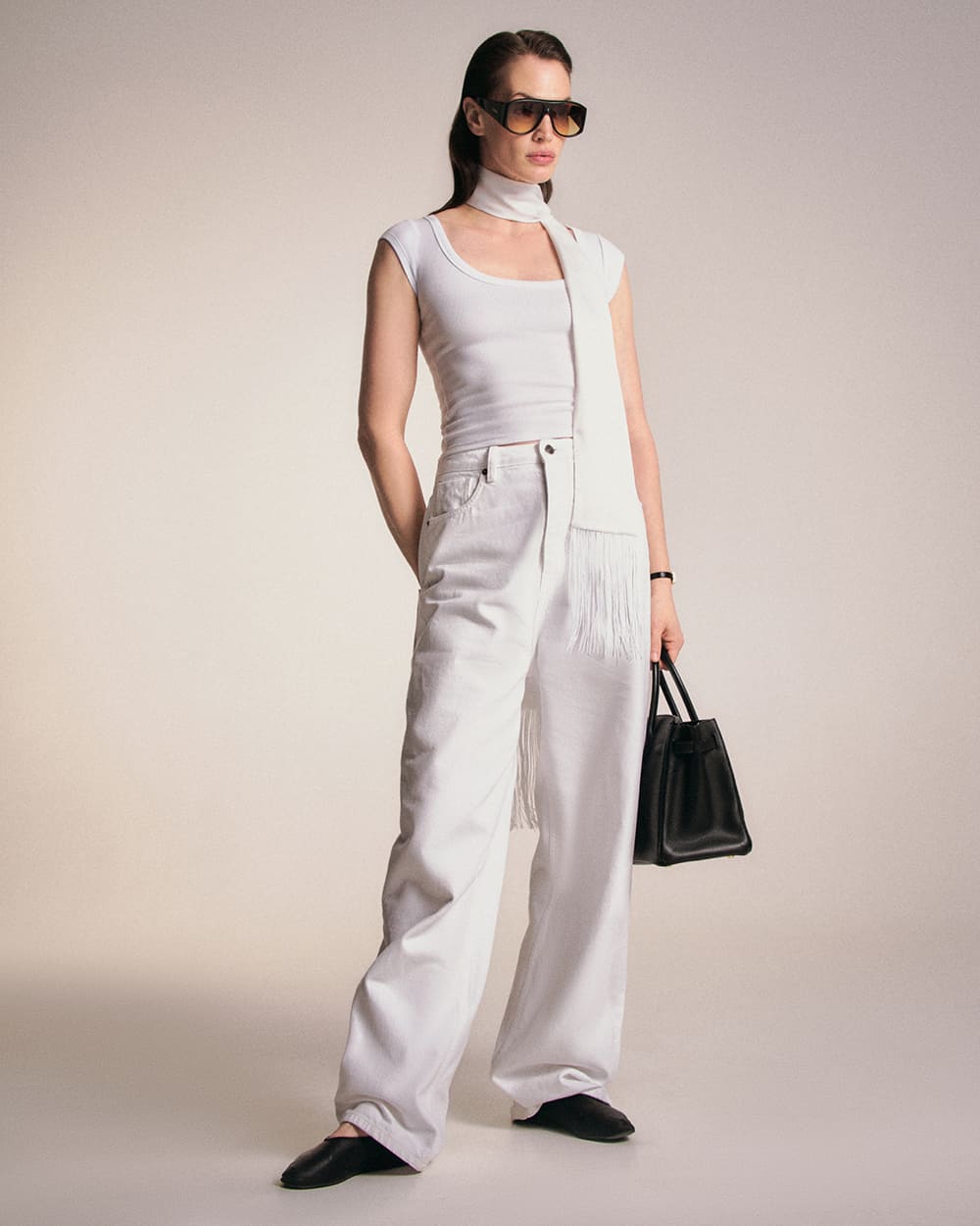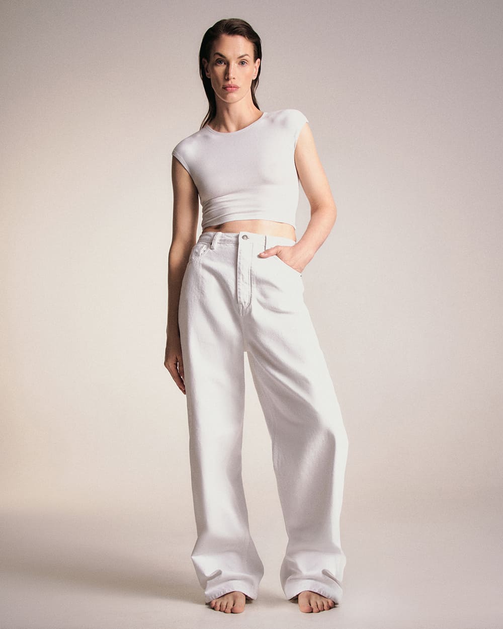 Широкие прямые джинсы в белом цвете с большими накладными карманами. Выполнены из плотного премиального денима. Благодаря удлиненному силуэту они ложатся мягкими складками на обувь. Фасон легко адаптируется под базовый гардероб и работает с абсолютно любым верхом.