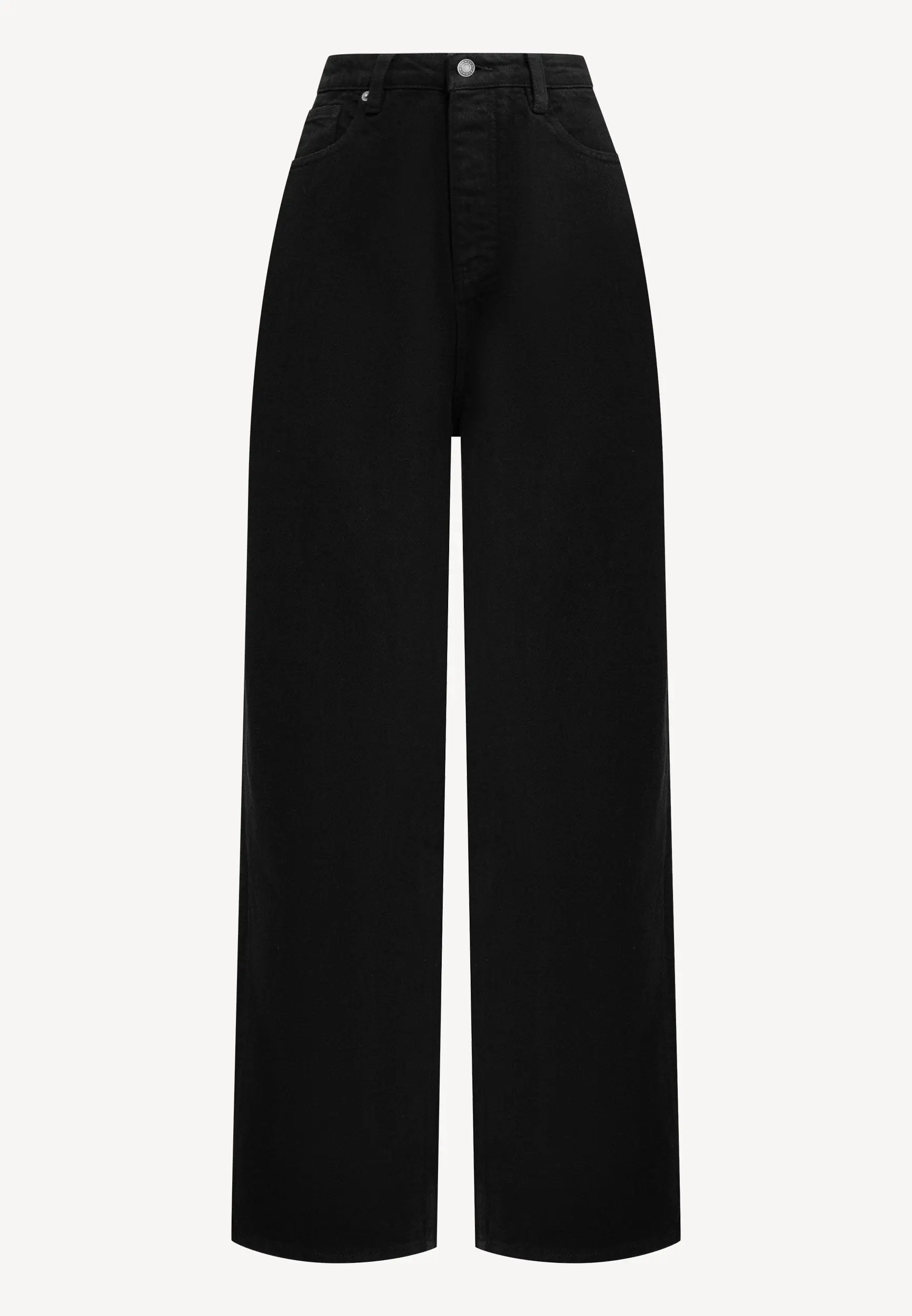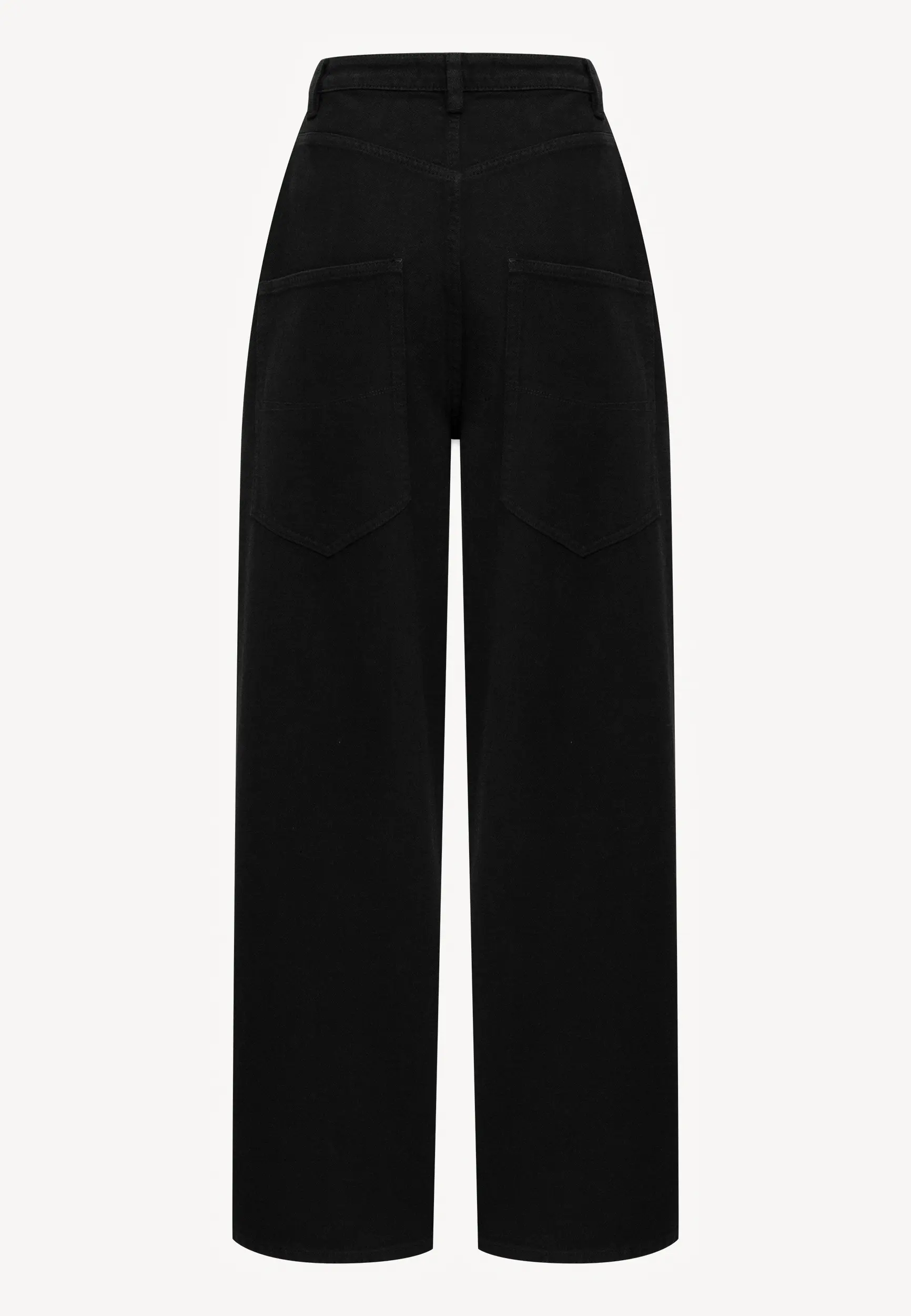 Широкие прямые джинсы в черном цвете с большими накладными карманами. Выполнены из плотного премиального денима. Благодаря удлиненному силуэту они ложатся мягкими складками на обувь. Фасон легко адаптируется под базовый гардероб и работает с абсолютно любым верхом.
