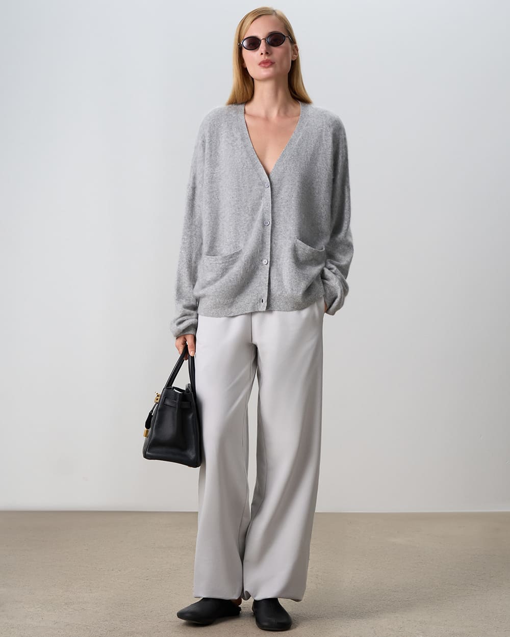 Свободный кардиган из кашемира с карманами и V-образным вырезом. Тонкий и мягкий, он идеально встроится в любой образ, даже в тот, в который казалось невозможным вписать теплые вещи.