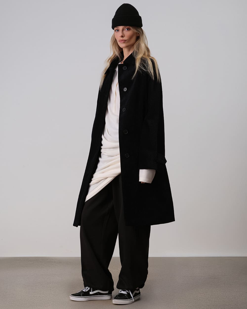 Длинное прямое платье из мягкого кашемирового полотна мелкой вязки в молочном оттенке. Легкое и тонкое, оно окутывает теплом, создавая ощущение комфортного "кокона" даже в морозную погоду. Центральная застежка на пуговицах позволяет регулировать степень открытости воротника и подчеркивает минималистичную стилистику изделия. Длина макси формирует цельный, гармоничный образ, который может быть дополнен аксессуарами, подобранными под настроение.