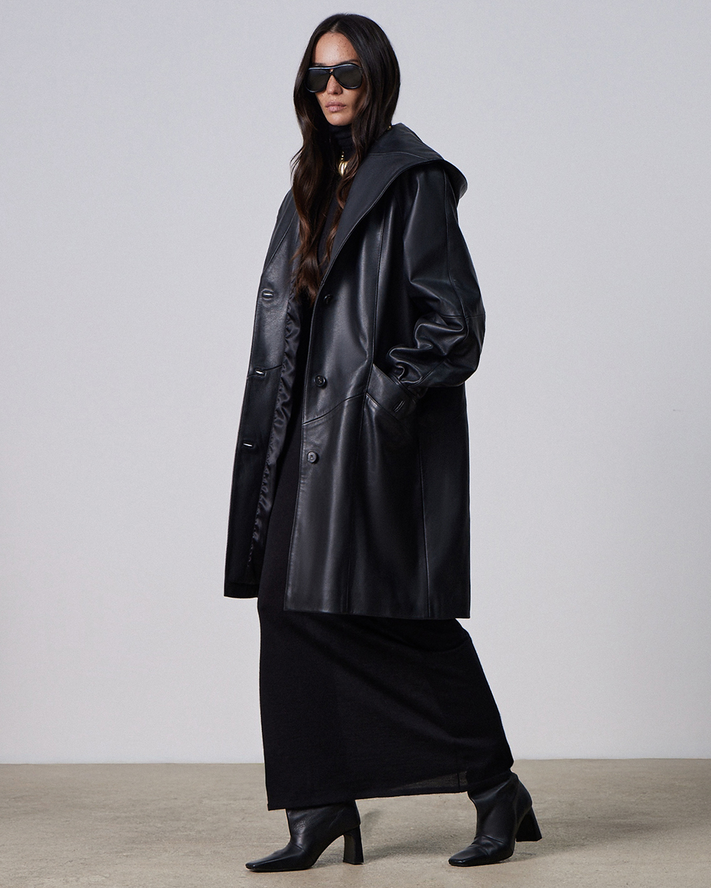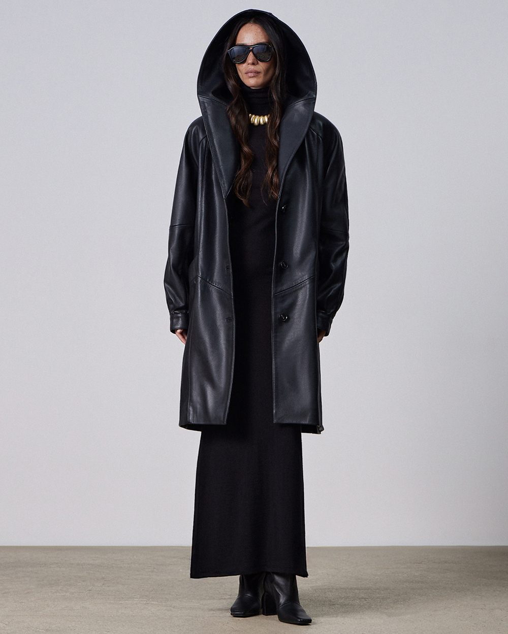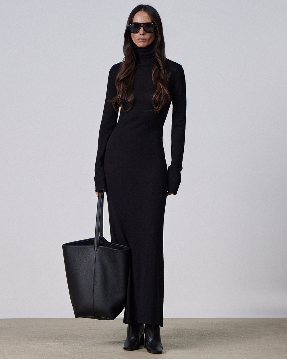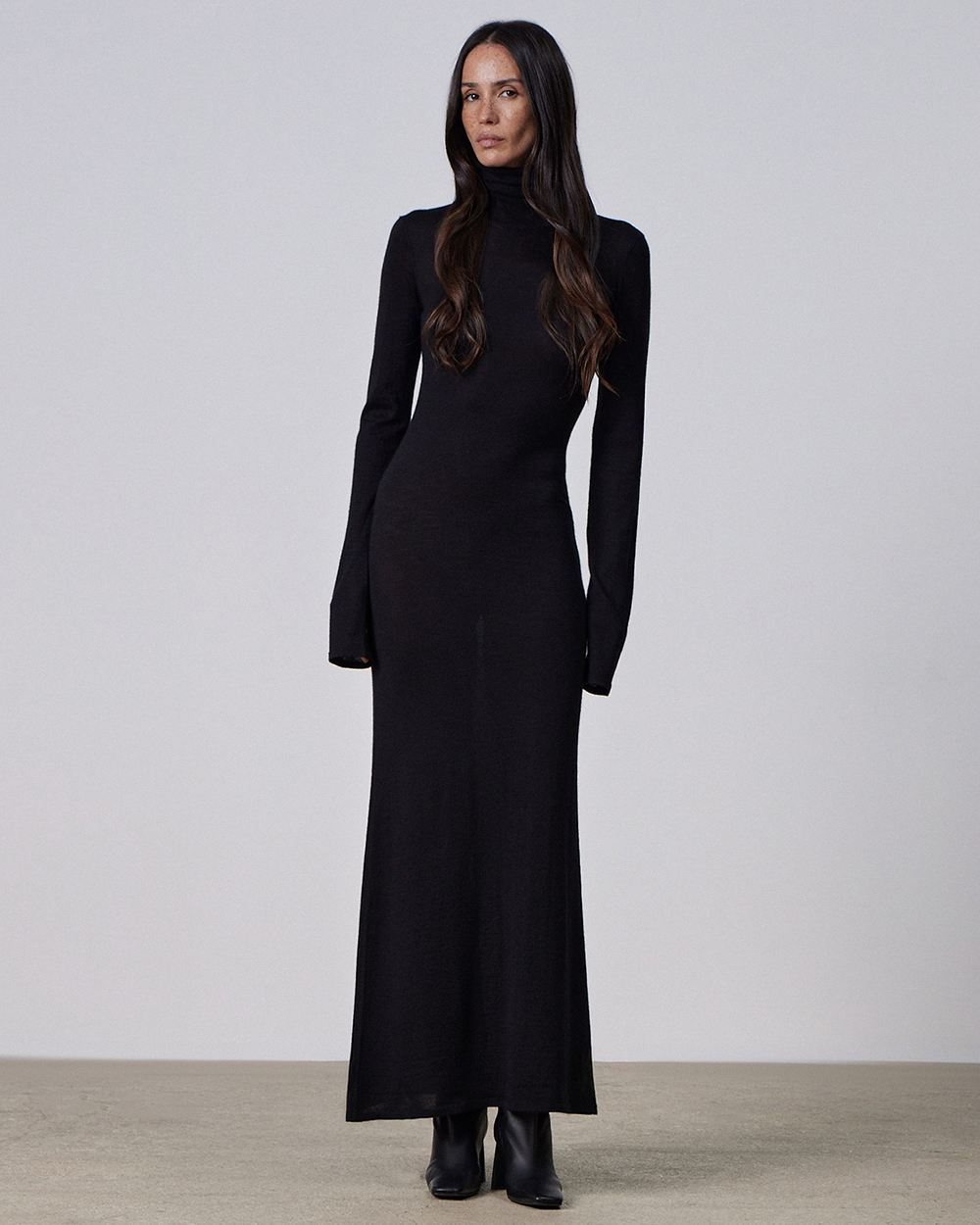 Длинное платье-водолазка из кашемира и шелка. Нежно прилегает к телу, создавая ощущение легкости и тепла; обладает едва уловимым шелковым блеском. Высокий воротник помогает подчеркнуть область шеи, красиво обрамляя лицо, и дает множество возможностей для использования аксессуаров.