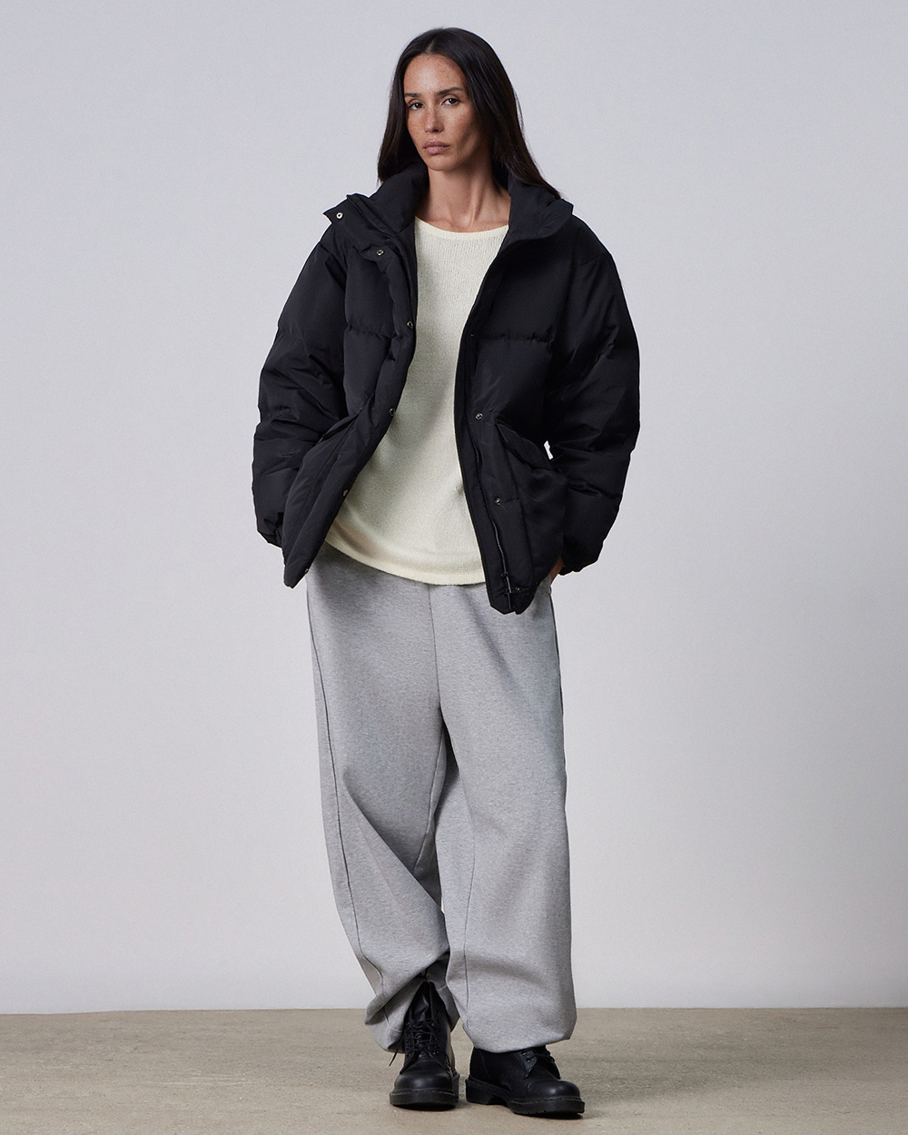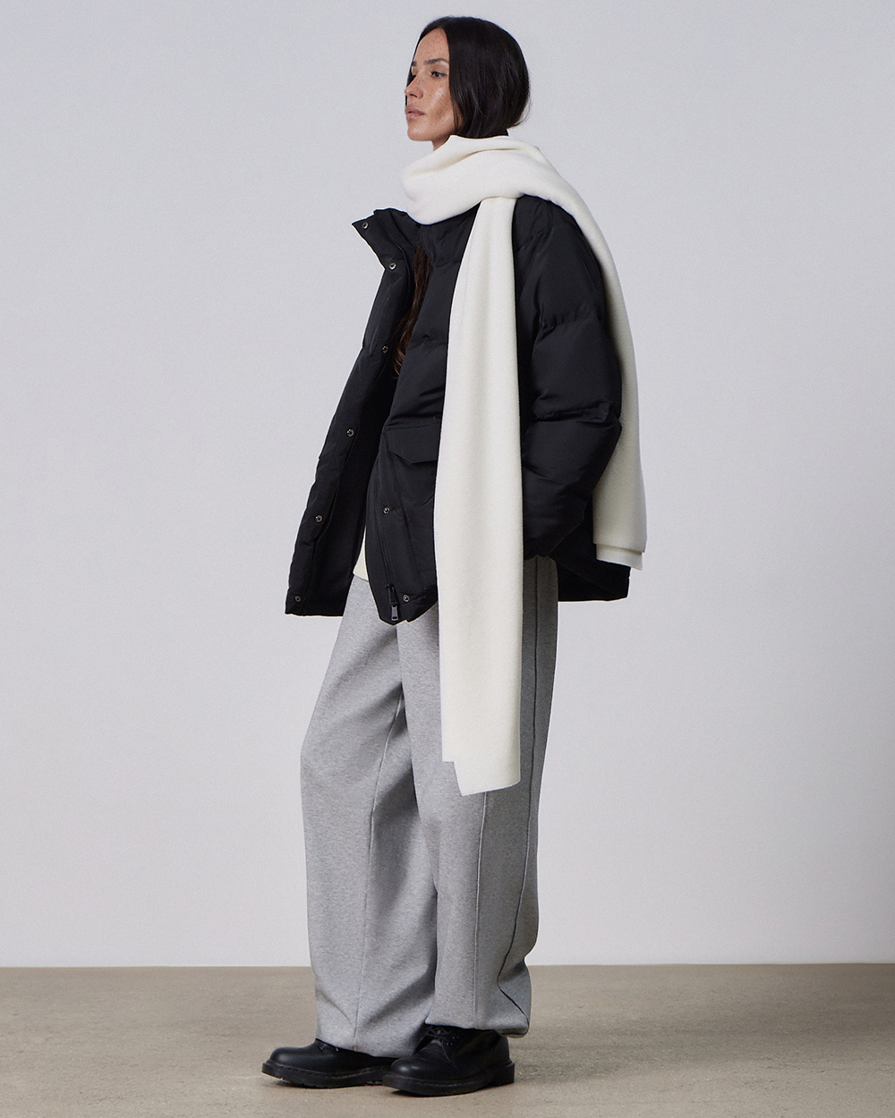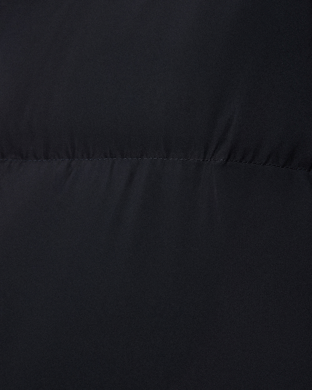 Поперечные строчки помогают поддерживать комфортный объем, обеспечивая равномерное распределение наполнителя из натуральных пуха и пера по площади пуховика.