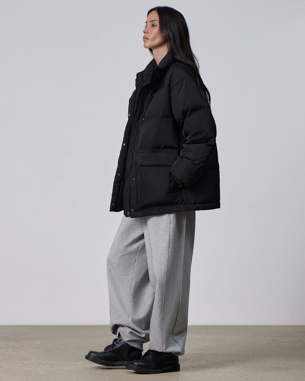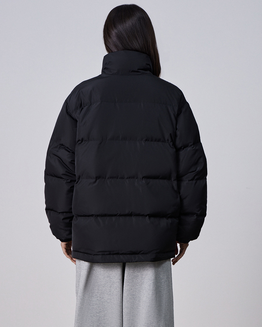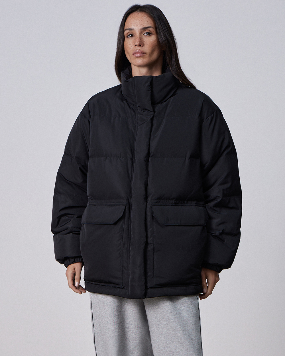 Объемный пуховик с воротником-стойкой и крупными накладными карманами в черном цвете. Обладает универсальной длиной, что помогает изделию быть максимально теплым, не ограничивая свободы движений.
