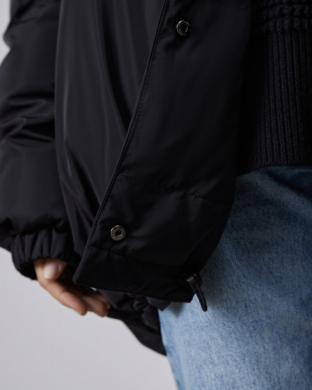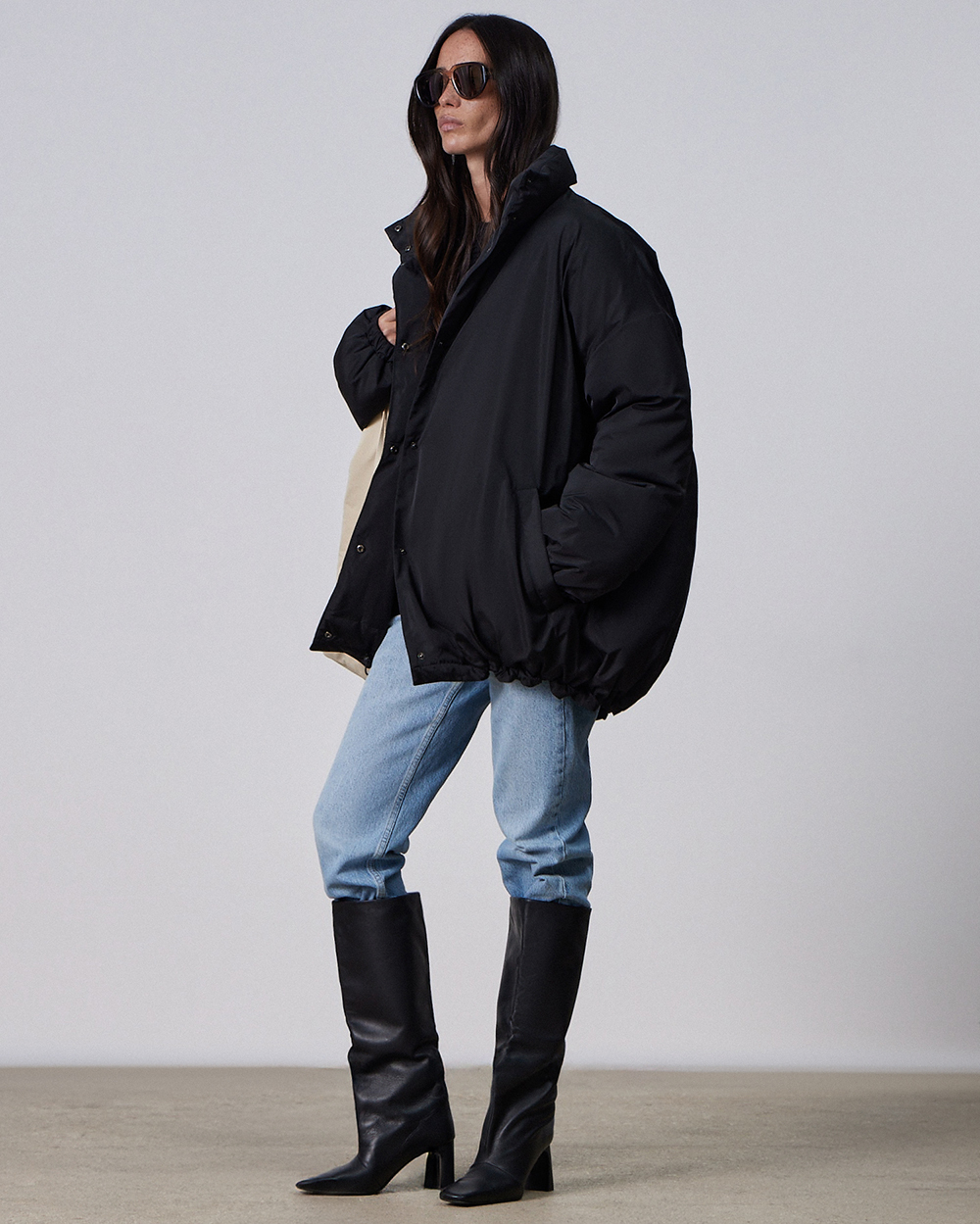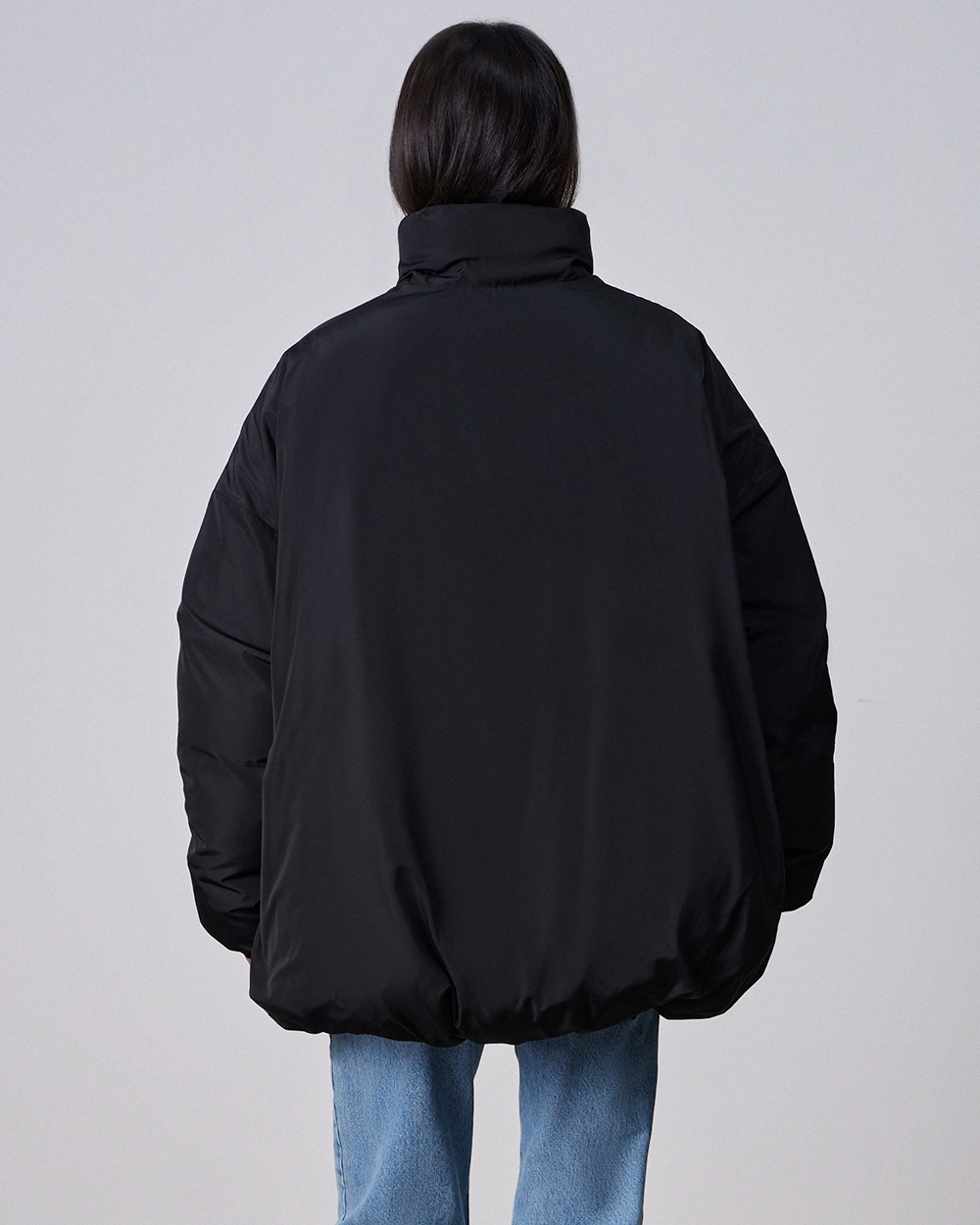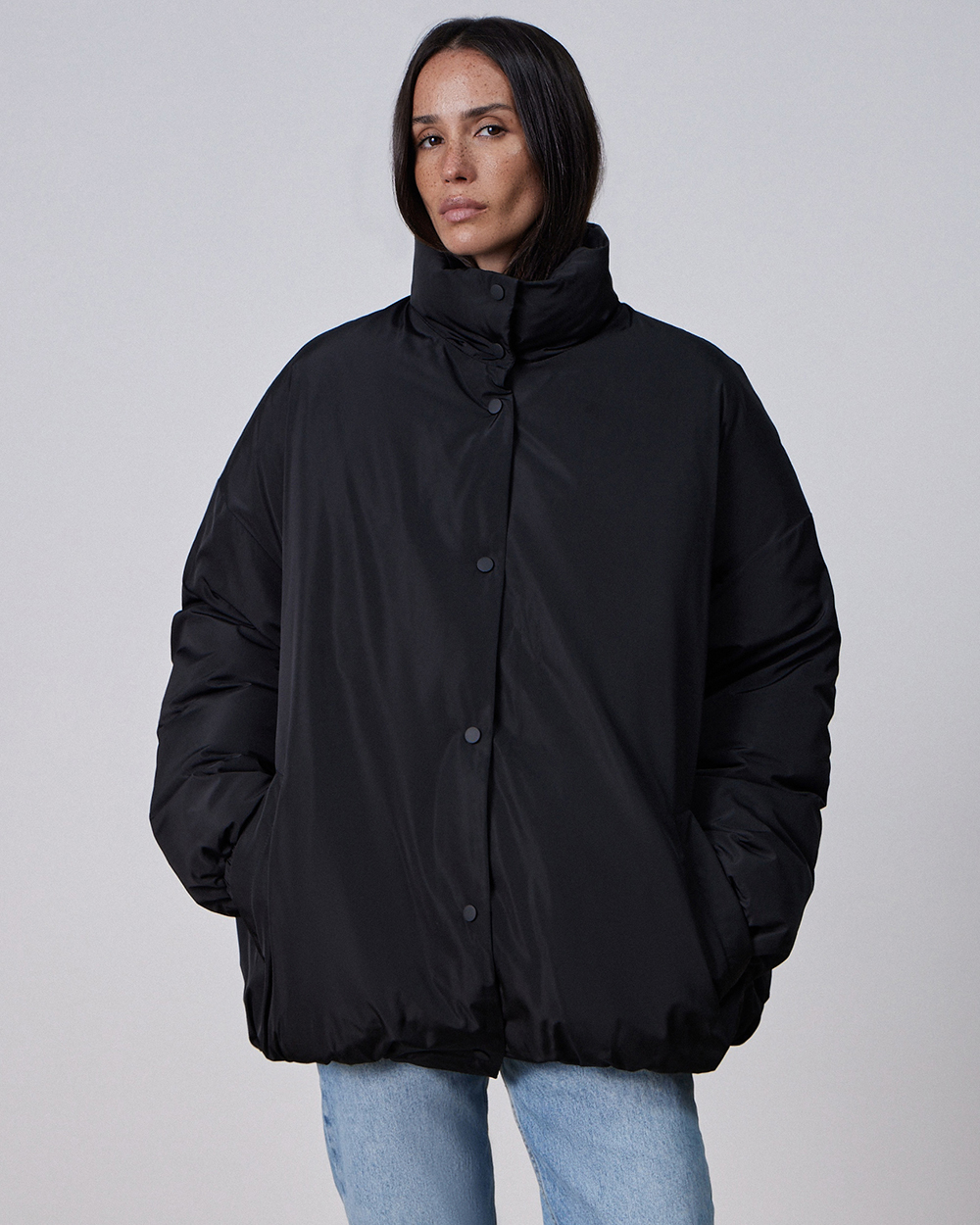 Объемный оверсайз-пуховик с воротником-стойкой в черном цвете. Сохраняет максимум тепла благодаря наполнителю из натуральных пуха и пера.